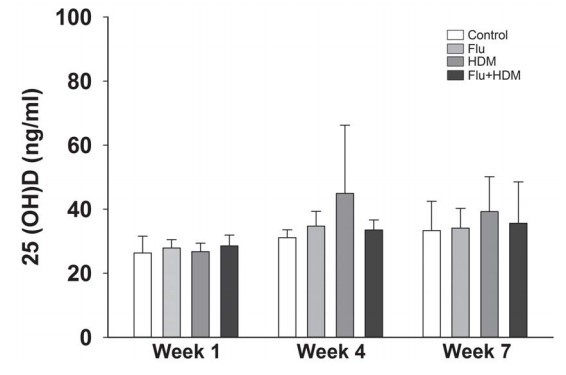Low circulating levels of 25-hydroxyvitamin D [25(OH)D] are associated with chronic lung diseases such as asthma. However, it is unclear whether vitamin D is involved in disease pathogenesis or is modified by the inflammation associated with the disease process. We hypothesized that allergic inflammation decreases the level of circulating 25(OH)D and tested this using a mice model of house dust mite (HDM) induced allergic airway inflammation. Cellular influx was measured in bronchoalvelar lavage (BAL) fluid, and allergic sensitization and 25(OH)D levels were measured in serum. Exposure to HDM caused a robust inflammatory response in the lung that was enhanced by prior influenza infection. These responses were not associated with any change in circulating levels of 25(OH)D. These data suggest that alterations in circulating 25(OH)D levels induced by Th-2 driven inflammation are unlikely to explain the cross-sectional epidemiological association between vitamin D deficiency and asthma.