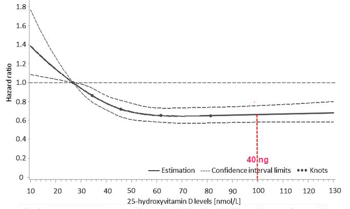 - Chance of dying in hospital cut in half by just 10 ng higher level of Vitamin D – April 2016