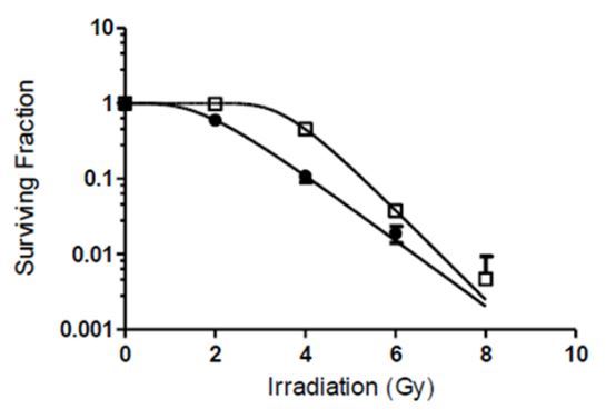 Cells were seeded in 6 well plates at a density of 200 cells per well. After attachment, cells were treated with 1,25(OH)2D3 (100 nmol/L) or vehicle for 24 hours. The cells were then unirradiated (control) or irradiated for total doses ranging from 0 to 8 Gy. Media containing 1,25(OH)2D3 was exchanged for fresh media. Cells were subsequently cultured under standard cell culture conditions for 8 days, with media were changed every third day. Colonies were stained with Giemsa solution, and colonies containing at least 50 cells in size were counted. The surviving fraction (SF) was calculated based on the plating efficiency of nonir- radiated control cultures treated with the vehicle. The survival curve was plotted using X-Y log scatter (Graph Prism 5.0). Based on the clonogenic survival assay, the dose enhancement ratio (DER) was calculated as the ratio of radiation doses required to give the same biological effect in the absence or the presence of 1,25(OH)2D3. The DER for 10% survival was determined. A DER greater than one is indicated radiosensitization.Y-H2AX immunofluorescence staining of cells
