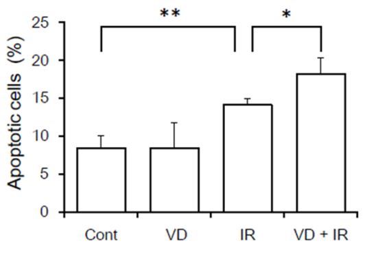 Apoptosis assay performed after 72 hour irradiation and demonstrated that 4 Gy irradiated cells pretreated with VD had more apoptotic cells (18.2 ± 2.2%) than cells treated with irradiation alone (14.1 ± 0.9%, P < 0.05; Figure 4). 1,25(OH)2D3 (100 nmol/L) alone had no effects on A549 cell apoptosis.Discussion