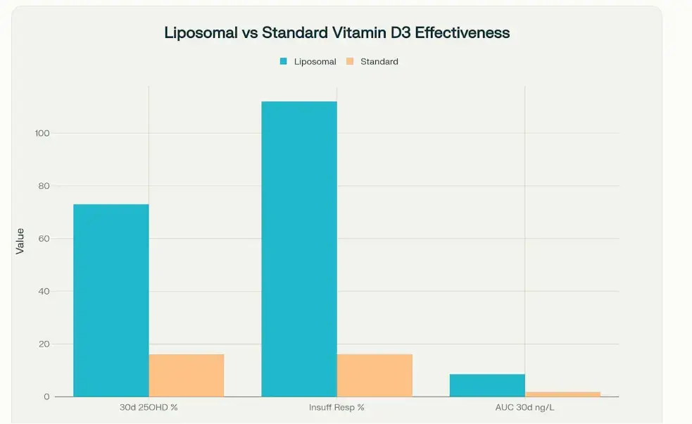 Pharmacokinetic Analysis: Research comparing liposomal to standard oil-based vitamin D3 found that the liposomal formulation delivered 4-5 times greater bioavailability.