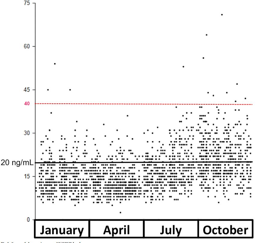 Serum 25(OH)D levels were less than 20ng/mL in 1,486 of 2,030 samples (73.2%). There was an obvious seasonal change, with serum 25(OH)D levels of less than 20 ng/mL in 89.8% and 47.8% of samples in spring (April) and autumn (October), respectively. Both the frequency spent under sunlight and dietary intake of vitamin D were significantly associated with serum 25(OH)D level. An increase in sunlight exposure of more than 15 min for 1 to 2 days per week in non-winter, or dietary intake of 2 μg/day of vitamin D resulted in an elevation of 1 ng/mL in serum 25(OH)D levels.