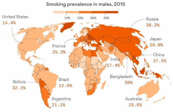 >30% of males in Russia, Indonesia, China, Bangladesh, Boliva ... still smoke