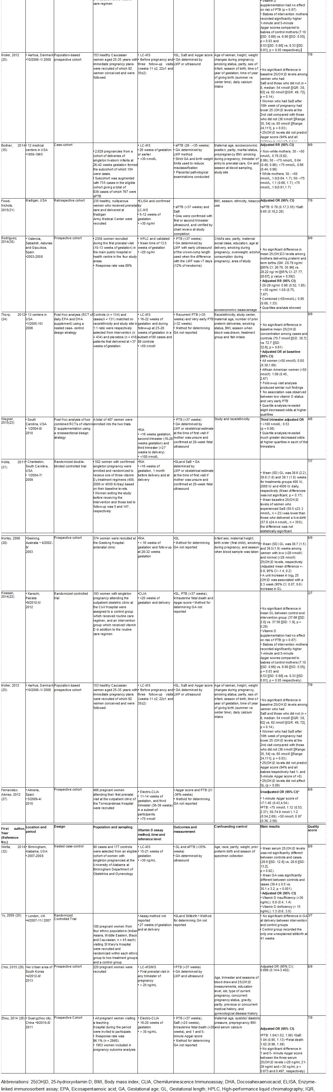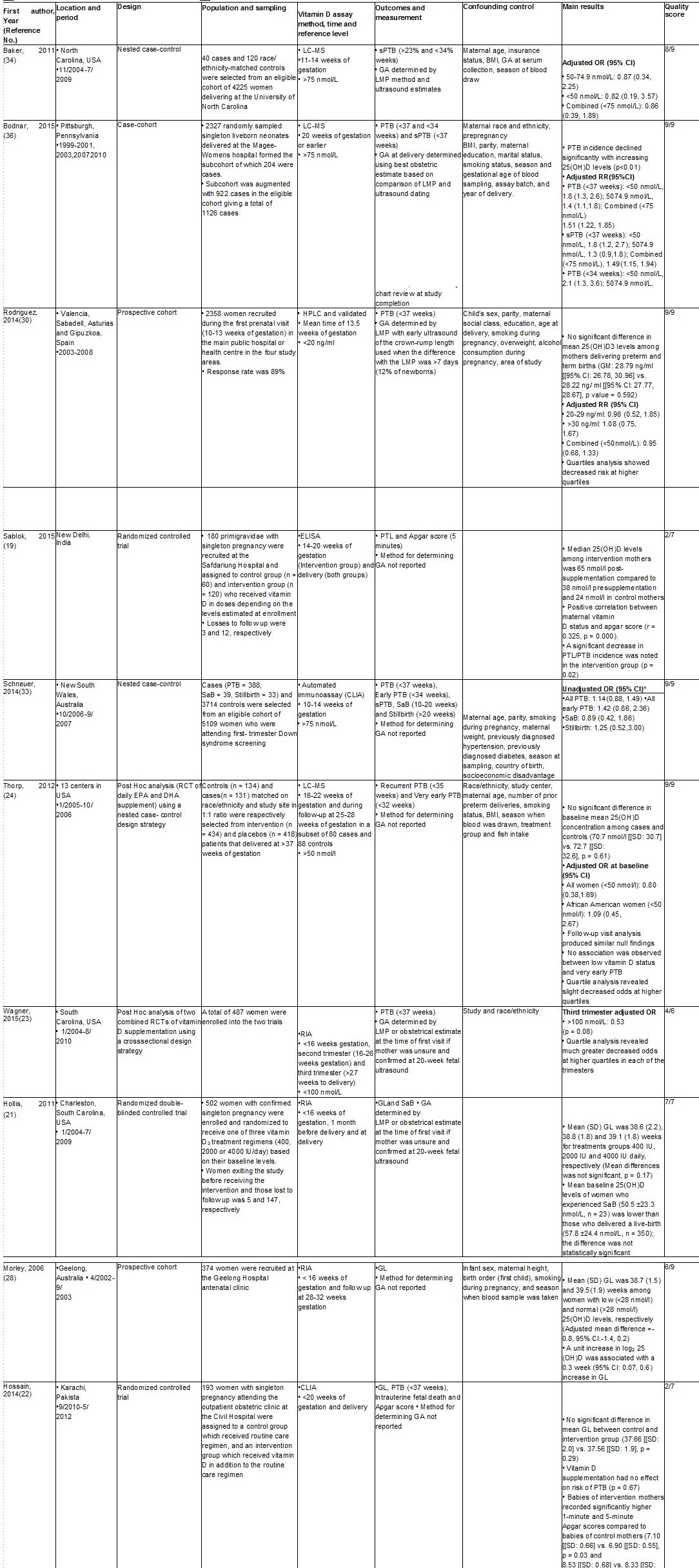 Abbreviations: 25(OH)D, 25-hydroxyvitamin D; BMI, Body mass index; CLIA, Chemiluminescence Immunoassay; DHA, Docosahexaenoicacid; ELISA, Enzyme-linked immunosorbent assay; EPA, Eicosapentaenoic acid; GA, Gestational age; GL, Gestational length; HPLC, High-performance liquid chromatography; IQR, Interquartile range; LC-MS, Liquid chromatography-tandem mass spectrometry; LMP, Last menstrual period; OR, Odds ratio; PTL, Preterm labour; RD, Risk difference; RIA, Radioimmunoassay; RR, Risk ratio/Relative risk; SaB, Spontaneous abortion; SD, Standard deviation; SE, Standard error; sPTB, Spontaneous preterm birth *Computed from data presented in manuscript.Selection bias was minimized in the nested case-control studies as the cases and controls originated from the same reference population and should be more representative. All four RCTs and the other two that underwent post hoc analysis also applied convenience sampling techniques in recruiting participants from health facilities. The extent to which these samples were representative of their reference populations were again not clear and hence, the potential for selection bias in these studies.