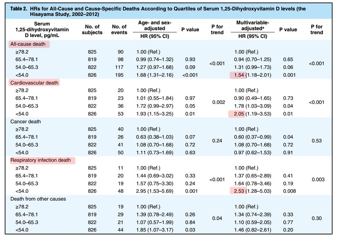 The findings suggested that a lower serum 1,25(OH)2D level is a potential risk factor for all-cause death, especially cardiovascular and respiratory infection death, in the general Japanese population, and that lower serum 1,25(OH)2D levels greatly increase the risk of respiratory infection death in subjects with kidney dysfunction.