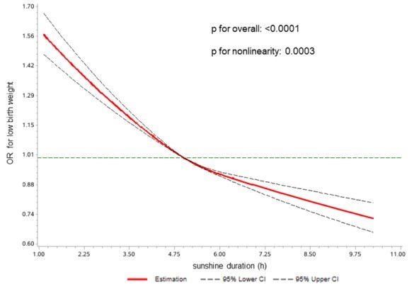 Perhaps 50% less likely to have low birth weight if there was lots of sunshine while pregnant
