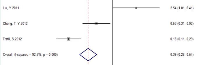 High circulating 25(OH)D levels also reduced lung cancer mortality with the pooled OR reached 0.39 (95% CI: 0.28-0.54, p < 0.001)]. A positive trend was presented in the relationship between serum 25(OH) D and survival (OR = 1.01, 95% CI: 0.87-1.18, p = 0.87).