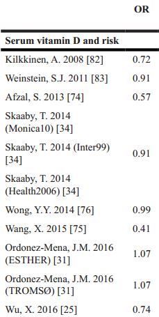 Lower serum level of 25-hydroxyvitamin D is associated with several negative outcomes. However, previous studies have indicated that 25-hydroxyvitamin D is associated with lung cancer risk and survival, but presented controversial results.
