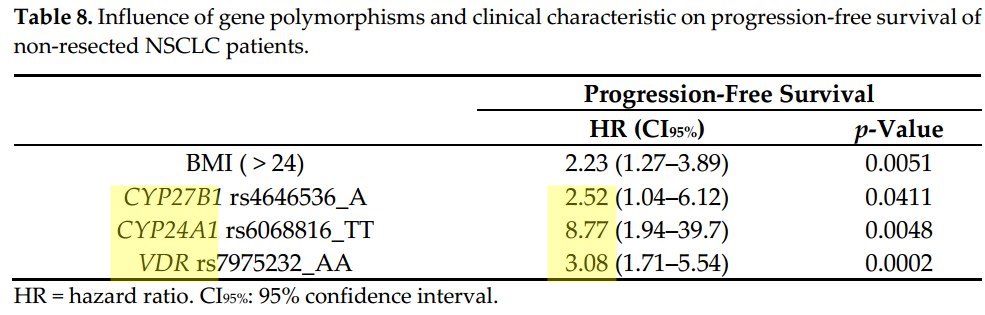 - Lung Cancer (NSLC) more lethal if poor Vitamin D gene ( CYP2R1) – Oct 2019
