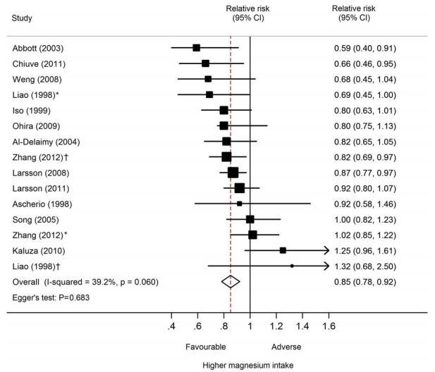 BACKGROUND: Prospective studies that have examined the association between dietary magnesium intake and serum magnesium concentrations and the risk of cardiovascular disease (CVD) events have reported conflicting findings. We undertook a meta-analysis to evaluate the association between dietary magnesium intake and serum magnesium concentrations and the risk of total CVD events.
