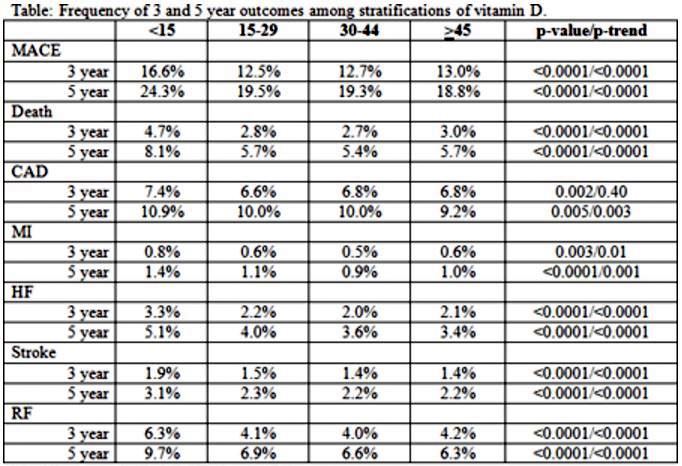 were studied. Event rates at 3 and 5-y by vitD group are shown in the Table. Adjusted 5 yr MACE HRs, using vitD<15 ng/mL as the comparator, were HR=0.80(p<0.0001), HR=0.75(P<0.0001) and HR=0.75(p<0.0001) for vitD ≥45 ng/mL, 30-44 ng/mL and 15-29 ng/mL respectively, and using vitD≥45 ng/mL as the comparator, were HR=1.34(p<0.0001), 1.07(p=0.02) and 1.00(p=0.93) for vitD<15 ng/mL, 15-29 ng/mL and 30-44 ng/mL respectively.