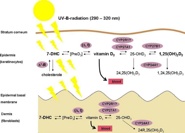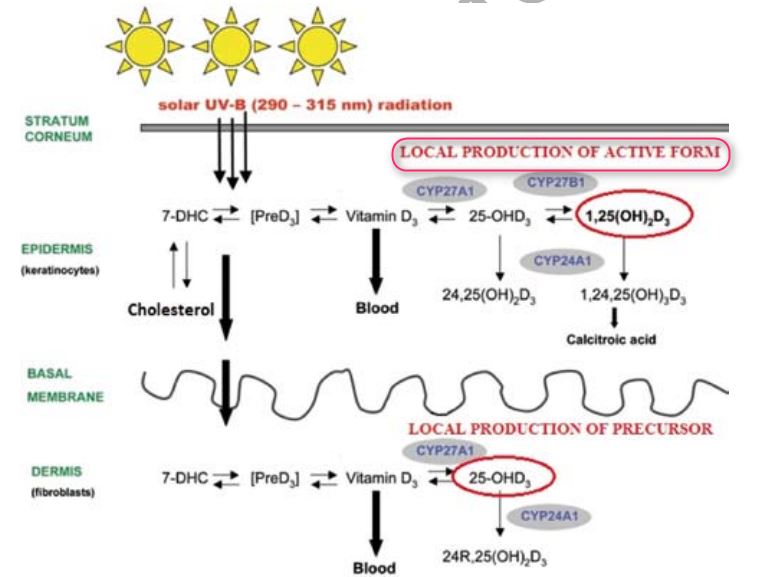 Extra-renal synthesis of 1,25(oH)2D has been repeatedly demonstrated in anephric humans [3]. At present it is not yet clear how much of the 1,25(oH)2D3 is produced by the epidermis and actually enters into circulation. experiments for these purposes measured the production of the active form of vitamin D in the skin of pigs without kidneys and evaluated the extent to which this participates in the total production of 1,25(oH)2D3 in systemic circulation in the basal state and after supplementation with precursors of the active form of Vitamin D. It was shown that only a minimal amount of the Vitamin D in systemic circulation was formed by the skin in the active form under normal conditions, but in anephric animals this proportion is increased [4]. UVB - triggered synthesis of calcitriol in human skin was demonstrated for the first time in vivo only in 2003 [5]. This means that 25(OH)D of photochemical origin, although predominant in systemic circulation, is not completely released from the skin, but a certain fraction is subjected to progressive hydroxylation directly in the keratinocytes. Fibroblasts in the skin can be a natural donor of precursors of the active form of Vitamin D, because they produce one of the necessary enzymes, 25-hydroxylase (CYP27A1), but not the other, 1a-hydroxylase (CYP27B1) [6]. The cutaneous synthesis of calcitriol (1,25(OH)2D3) is attributed to the effect of intracrine and/or autocrine on the keratinocytes themselves and paracrine on the adjacent cells, which may be melanocytes or malignant melanoma cells [7].