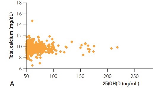 Our results agree with those of previous studies demonstrating that clinical vitamin D toxicity is rare, even with serum 25(OH)D concentrations above 100 ng/mL. It is debatable how these findings apply to the most recent guidelines on vitamin D supplementation. The Endocrine Society guidelines,13 which target populations at risk of vitamin D deficiency, recommend a daily vitamin D intake of 10,000 IU as the UL, corresponding to a 25(OH)D concentration of 100 ng/mL. The UL is the maximum daily intake not expected to pose any harm to the general population. Even though we found 3 individuals with mild hypercalcemia attributed to 25(OH)D in the 51 to 100 ng/mL range, the clinical importance of this is not clear. These patients had no associated low PTH, which would be expected to be suppressed, and no clinical symptoms. Thus, our results support the position that 25(OH)D values up to 100 ng/mL are unlikely to cause acute harm.