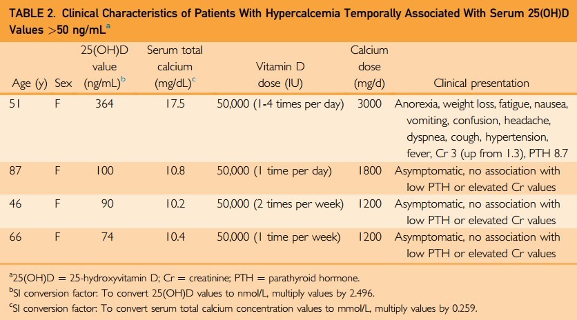 Of the 1714 patients with 25(OH)D values above 50 ng/mL, medical record abstraction revealed only 4 (0.2%) cases in whom the vitamin D concentration was temporally associated with hypercalcemia (see Table 2). In these cases, the increase in calcium concentration from normal to high values was temporally associated with vitamin D supplementation, resolution of hypercalcemia after the cessation of vitamin D supplementation, and no alternative explanation for hypercalcemia (eg, excess calcium ingestion or primary hyperparathyroidism) was documented, satisfying our definition of causality. All were adult women who were taking 50,000 IU of vitamin D at least weekly for a minimum of 1 month. Three cases had very mild hypercalcemia and remained asymptomatic with no associated low PTH or elevated creatinine values. The only case of clinical vitamin D toxicity was a 51-year- old woman who presented with a 25(OH)D value of 364 ng/mL and a serum total calcium level of 17.5 mg/dL. She was taking 50,000 IU of vitamin D and 3000 mg of calcium at least once daily for more than 3 months. She presented with acute kidney injury in the setting of stage 3 chronic kidney disease, low PTH, and symptoms of severe hypercalcemia, including fatigue, anorexia, weight loss, nausea, vomiting, and confusion.