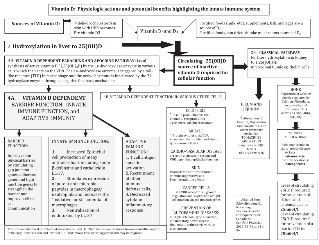 This review looks at the critical role of vitamin D in improving barrier function, production of antimicrobial peptides including cathelicidin and some defensins, and immune modulation. The function of vitamin D in the innate immune system and in the epithelial cells of the oral cavity, lung, gastrointestinal system, genito-urinary system, skin and surface of the eye is discussed. Clinical conditions are reviewed where vitamin D may play a role in the prevention of infections or where it may be used as primary or adjuvant treatment for viral, bacterial and fungal infections. Several conditions such as tuberculosis, psoriasis, eczema, Crohn's disease, chest infections, wound infections, influenza, urinary tract infections, eye infections and wound healing may benefit from adequate circulating 25(OH)D as substrate. Clinical diseases are presented in which optimization of 25(OH)D levels may benefit or cause harm according to present day knowledge. The safety of using larger doses of vitamin D in various clinical settings is discussed. PMID: 20824663