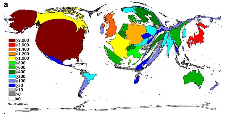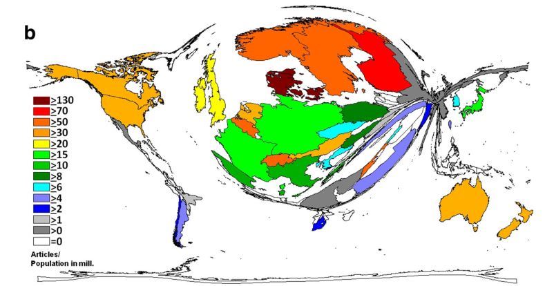 A total of 25,992 vitamin D-related research articles were identified between 1900 to 2014 with a significant increase (r2 = .6541) from 1900 to 2014. Authors located in Northern America – especially in the USA – distributed the majority of global vitamin D research, followed by their Western European counterparts. DEMP-analysis illustrates that Africa and South America exhibit only minor scientific productivity. Among high-income group countries, Scandinavian nations such as Denmark or Finland (2147.9 and 1607.7 vitamin D articles per GDP in 1000 billion USD) were highly active with regard to socioeconomic figures.