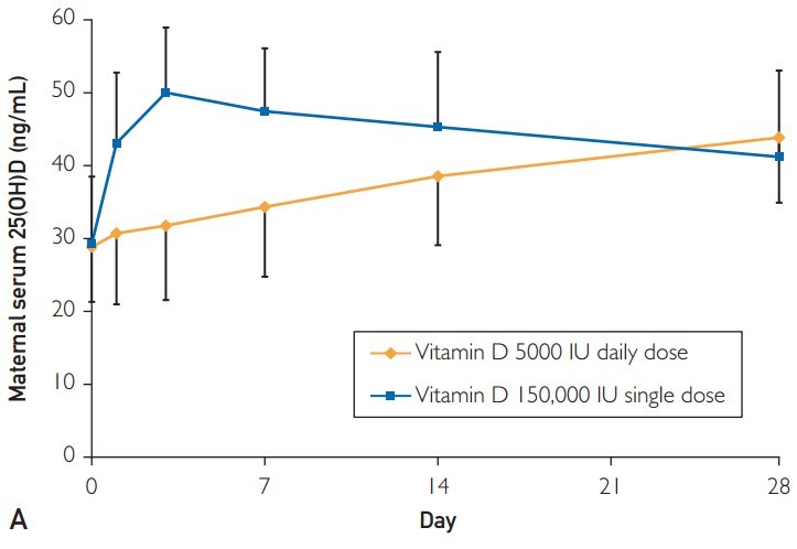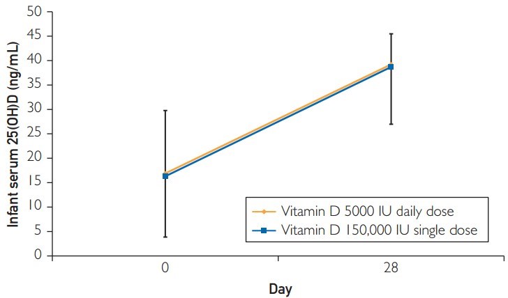 In mothers given daily cholecalciferol, concentrations of serum and breast milk cholecalciferol attained steady levels of 18 and 8 ng/mL, respectively, from day 3 through 28. In mothers given the single dose, serum and breast milk cholecalciferol peaked at 160 and 40 ng/mL, respectively, at day 1 before rapidly declining. Maternal milk and serum cholecalciferol concentrations were related (r=0.87). Infant mean serum 25-hydroxyvitamin D concentration increased from 17±13 to 39±6 ng/mL in the single-dose group and from 16±12 to 39±12 ng/mL in the daily-dose group (P=.88). All infants achieved serum 25-hydroxyvitamin D concentrations of more than 20 ng/mL.