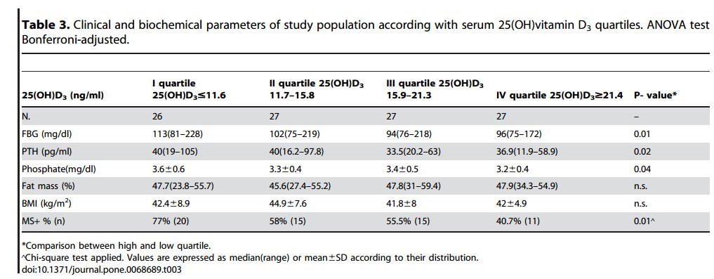 This indicates that the association between low 25(OH) D3 levels and MS is not merely induced by vitamin D deposition in fat tissue and reinforces the hypothesis that hypovitaminosis D represent a crucial independent determinant of MS.