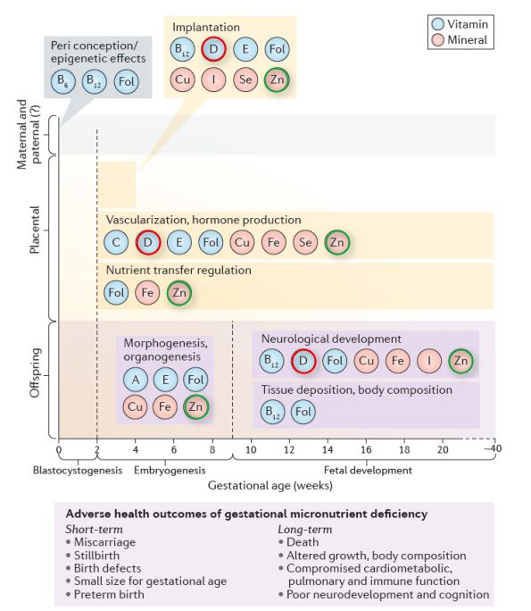 Folic acid and vitamin D might also increase birth weight. While extensive mechanistic and association research links multiple antenatal micronutrients with plausible materno-fetal health advantages, hypothesized benefits have often been absent, minimal or unexpected in trials. These findings suggest a role for population context in determining health responses and filling extensive gaps in knowledge. Multiple micronutrient supplements reduce the risks of being born with low birth weight, small for gestational age or stillborn in undernourished settings, and justify micronutrient interventions with antenatal care. Measurable health effects of gestational micronutrient exposure might persist into childhood but few data exists on potential long-term benefits. In this Review, we discuss micronutrient intake recommendations, risks and consequences of deficiencies, and the effects of interventions with a particular emphasis on offspring.