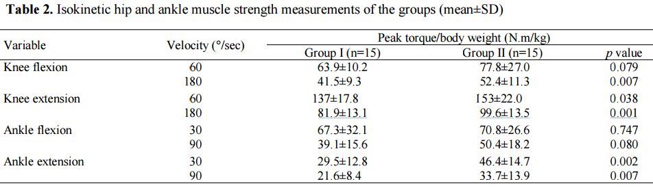 Mean of 25(OH)D was 9.4±2.5 ng/mL and 20.7±8.3 ng/mL in Groups I and II, respectively. Although all isokinetic strength parameters were lower in Group I, significant differences were found in knee flexion at 180°/sec (p=0.007), knee extension at 30°/sec (p=0.038) and 180°/sec (p=0.001), and ankle extension at 30°/sec (p=0.002) and 90°/sec (p=0.007). On the other hand, no significant difference was found between the groups regarding MT, PA and FL values (all p>0.05).