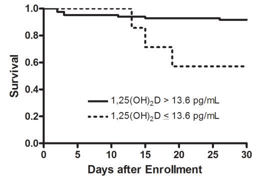 In sepsis, the vitamin D active metabolite 1,25-dihydroxyvitamin D (1,25(OH)2D) may play a crucial role by its action to produce cathelicidin and improve endothelial barrier function, such that a deficiency in 1,25(OH)2D is associated with poor outcome. To test our hypothesis, we performed analysis of stored plasma samples from a prospective observational study in 91 patients with sepsis, age of 59.1+/−2.0 years, 52.7% females, and 11.0% deaths at 30 days. Vitamin D status, including 25-hydroxyvitamin D (25(OH)D), 1,25(OH)2D, 24,25-dihydroxyvitamin D (24,25(OH)2D), and parathyroid hormone (PTH), were measured daily over 3 days after hospital admission. At baseline, 1,25(OH)2D was significantly different between survivors vs. non-survivors. But there was no significant difference in 25(OH)D, 24,25(OH)2D, and PTH. In a multivariable binomial logistic regression model, age, total calcium and 1,25(OH)2D were significant predictors of 30-day mortality. Kaplan Meier analysis showed that patients with mean 1,25(OH)2D measured over 3 days of < = 13.6 pg/mL had 57.1% 30-day survival compared to 91.7% in patients with 1,25 (OH)2D level >13.6 pg/mL (p<0.01). From repeated measures regression analysis, there was significant increase in 1,25(OH)2D for increases in 25(OH)D in both survivors and non-survivors. However, compared to survivors, the low 25(OH)D in non-survivors was insufficient to account for the larger decrease in 1,25(OH)2D, indicating a dysfunctional 1α-hydroxylase. Additionally, there was a significant negative correlation between PTH and 1,25(OH)2D in both survivors and non-survivors, suggesting a severe impairment in the effect of PTH to increase renal 1α-hydroxylase activity. In conclusion, low 1,25(OH)2D levels are associated with increased 30-day mortality in sepsis patients, likely due to impaired 25(OH)D hydroxylation and PTH insensitivity. Our data also suggest that the active metabolite 1,25(OH)2D may be an important therapeutic target in the design of sepsis clinical trials.