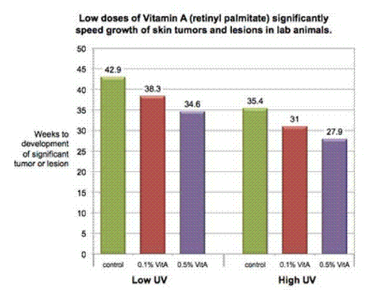 Graph from EWG which shows that vitamin A in skin cream INCREASES the grown of skin tumors, especially when exposed to UV = sunshine