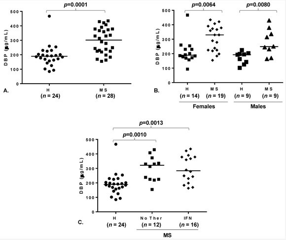 Figure 1. Plasma vitamin D binding protein (DBP) is increased in multiple sclerosis (MS) patients. Dot plots of plasma DBP concentration in MS patients and healthy controls. Horizontal lines indicate median values. (A) Comparison of healthy controls with MS patients. (B) Subject stratification by gender. Information about gender was missing for one healthy donor, which was excluded from this analysis. (C) Patient stratification by therapy. H, healthy donors; MS, MS patients (all in the remission phase of the disease); IFN, patients undergoing IFNβ therapy; No Ther, patients not undergoing any therapy. p value ≤0.05 were considered to reflect statistical significance.