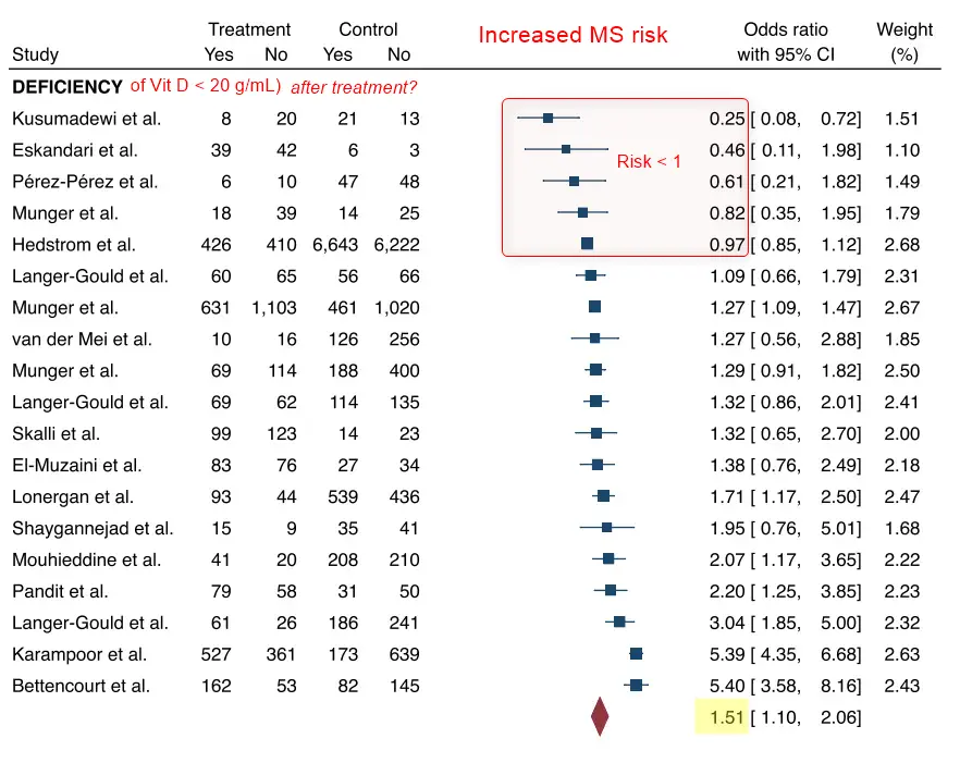 Vitamin D defciency was associated with the occurrence of MS (ES = 1.51, 95% CI = 1.10–2.06) (Fig. 5). Studies assessed vitamin D levels at diferent time points prior to diagnosis, and most did not specify them.