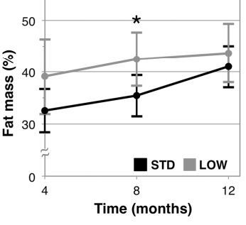 - less lean body mass after 8 months (57.5% ± 5.1% versus 64.5% ± 4.0%, p=0.023),