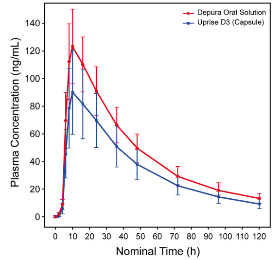 Nanoemulsion oral solution of cholecalciferol showed a greater bioavailability compared with soft gelatin capsules, under fasting conditions, in healthy human participants.