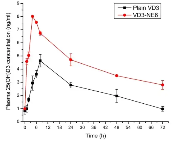 Conclusion: Our findings indicate that a nanoemulsion-based delivery system is a promising approach to improve VD bioavailability, and further studies are warranted to determine its efficacy in humans.
