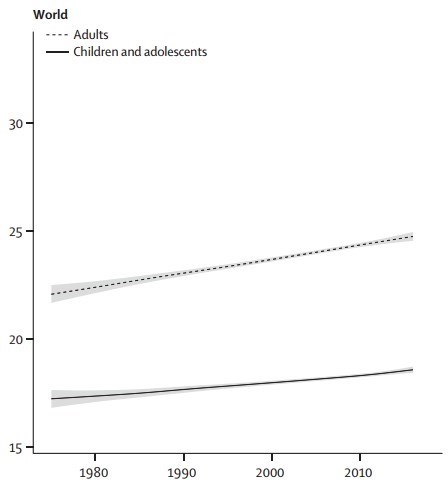 Underweight, overweight, and obesity in childhood and adolescence are associated with adverse health consequences throughout the life-course. Our aim was to estimate worldwide trends in mean body-mass index (BMI) and a comprehensive set of BMI categories that cover underweight to obesity in children and adolescents, and to compare trends with those of adults.Methods