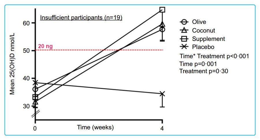 Food fortification improves vitamin D intakes but is not yet mandated in many countries. Combining vitamin D with different dietary lipids altered vitamin D absorption in in vitro and postprandial studies. This randomised, placebo-controlled trial examined the effect of the lipid composition of a vitamin D-fortified dairy drink on change in 25-hydroxyvitamin D (25(OH)D) concentrations. Sixty-three healthy adults aged 50+ years were randomised to one of the following for 4 weeks: vitamin D-fortified olive oil dairy drink, vitamin D-fortified coconut oil dairy drink, vitamin D supplement or placebo control dairy drink. All vitamin D groups received 20 µg of vitamin D3 daily. Serum was collected at baseline and post-intervention to measure 25(OH)D concentrations and biomarkers of metabolic health. Repeated-measures general linear model ANCOVA (RM GLM ANCOVA) compared changes over time. There was a significant time × treatment interaction effect on 25(OH)D concentrations for those classified as vitamin D-insufficient (P < 0·001) and -sufficient at baseline (P = 0·004). 25(OH)D concentrations increased significantly for all insufficient participants receiving vitamin D3 in any form. However, for vitamin D-sufficient participants at baseline, 25(OH)D concentrations only increased significantly with the coconut oil dairy drink and supplement. There was no effect of vitamin D on biomarkers of metabolic health. Vitamin D fortification of lipid-containing foods may be used in lieu of supplementation when supplement adherence is low or for individuals with dysphagia. These results are important given the recent recommendation to increase vitamin D intakes to 15-20 µg for older adults in Ireland.