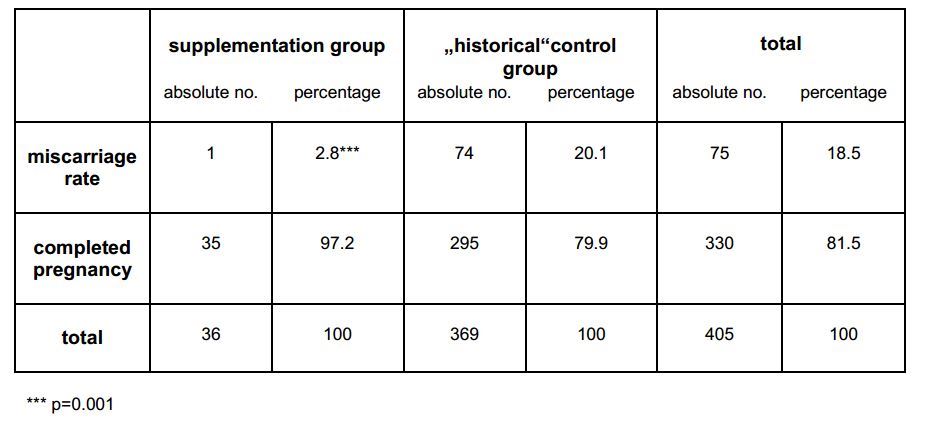The influence of omega-3-fatty acid supplementation on miscarriage rates in patients after successful IVF-therapy revealed also first encouraging data. Out of the 36 patients comprhending omega-3-fatty acid-supplemented group which became successfully pregnant, just 1 patient suffered from a miscarriage later during pregnancy (2.8%), whereas in 20.1% of the non-supplemented control group miscarriage occurred. Although this ratio is significantly higher it is of limited validity and explanatory power due to the small size of both study branches well as their relation in size.