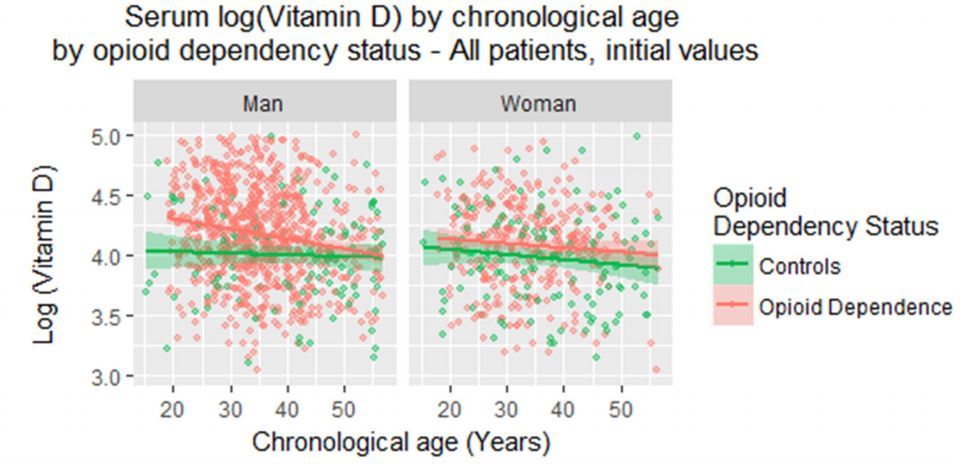 Compare vitamin D levels in opioid dependence and control population and adjust for relevant confounding effects. Nuclear hormone receptors (including the vitamin D receptor) have been shown to be key transducers and regulators of intracellular metabolism and comprise an important site of pathophysiological immune and metabolic dysregulation potentially contributing towards pro-ageing changes observed in opioid-dependent patients (ODPs).