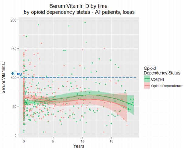 Opioid depedents have LOWER vitamin D levels than controls after 4 years