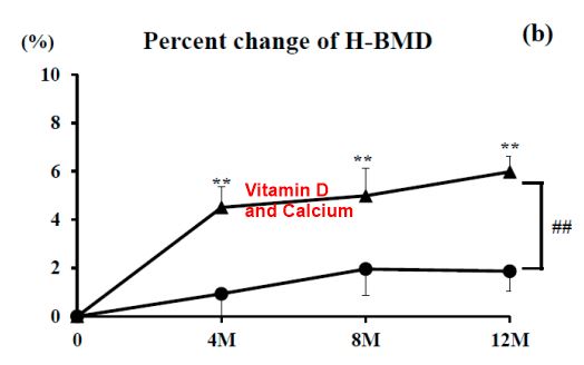 3 Center of Osteoporosis and Spinal Disorders, Kamimura Orthopaedic Clinic, Matsumoto, Japan.To evaluate the differences in outcomes of treatment with denosumab alone or denosumab combined with vitamin D and calcium supplementation in patients with primary osteoporosis. Patients were split into a denosumab monotherapy group (18 cases) or a denosumab plus vitamin D supplementation group (combination group; 23 cases). We measured serum bone alkaline phosphatase (BAP), tartrate-resistant acid phosphatase (TRACP)-5b and urinary N-terminal telopeptide of type-I collagen (NTX) at baseline, 1 week, as well as at 1 month and 2, 4, 8 and 12 months. We also measured bone mineral density (BMD) of L1-4 lumbar vertebrae (L)-BMD and bilateral hips (H)-BMD at baseline and at 4, 8 and 12 months. There was no significant difference in patient background. TRACP-5b and urinary NTX were significantly suppressed in both groups from 1 week to 12 months (except at 12 months for NTX). In the combination group, TRACP-5b was significantly decreased compared with the denosumab monotherapy group at 2 and 4 months (P<0.05). BAP was significantly suppressed in both groups at 2-12 months. L-BMD significantly increased at 8 and 12 months (8.9%) in the combination group and at 4, 8 and 12 months (6.0%) in the denosumab monotherapy group, compared with those before treatment. H-BMD was significantly increased in the combination group (3.6%) compared with the denosumab group (1.2%) at 12 months (P<0.05). Compared with denosumab monotherapy, combination therapy of denosumab with vitamin D and calcium stopped the decrease in calcium caused by denosumab, inhibited bone metabolism to a greater extent, and increased BMD (especially at the hips).