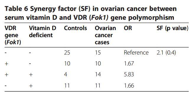 CONCLUSION: Low blood levels of vitamin D and VDR receptor polymorphism (FokI) might be a risk factor for the development of ovarian cancer. Other novel ligands of vitamin D receptor might be responsible for the non-synergistic effect.