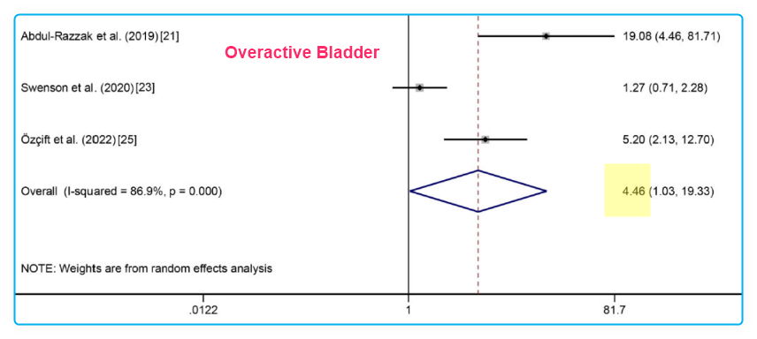 It not known whether vitamin D deficiency can lead to overactive bladder or urinary incontinence or whether vitamin D supplementation alleviates bladder symptoms. This comprehensive systematic review with meta-analysis was conducted to determine whether overactive bladder is associated with vitamin D deficiency.