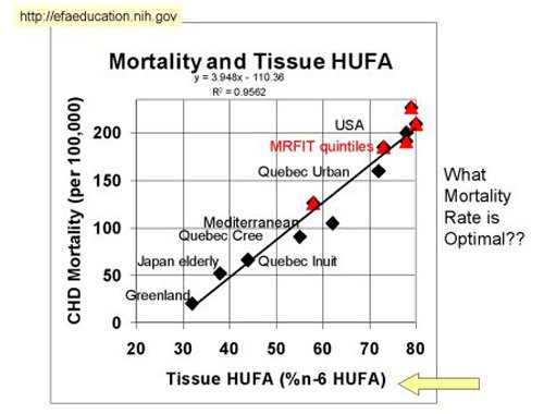 - Mortality associated with HUFA (Highly Unsaturated Fatty Acids = Omega-6)