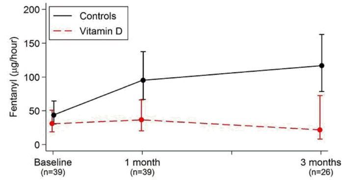 After 1 month the vitamin D treated group had a significantly decreased fentanyl dose compared to the untreated group with a difference of 46 μg/h; 95% CI 24–78, which increased further at 3 months to 91 μg/h; 95% CI 56–140 μg/h. The ESAS QoL-score improved in the Vitamin D group the first month; -1.4; 95% CI -2.6 - (-0.21). The vitamin D-treated group had significantly lower consumption of antibiotics after 3 months compared to the untreated group, the difference was -26%; 95%CI -0.41%–(-0.12%). Vitamin D was well tolerated by all patients and no adverse events were reported.