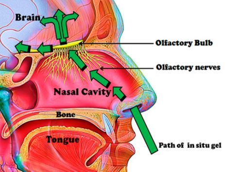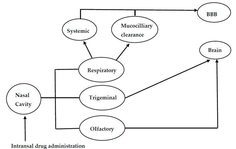 In spite of the significant merit of bypassing the BBB, direct nose-to-brain delivery still bears the problems of low efficiency and volume for capacity due to the limited volume of the nasal cavity, the small area ratio of olfactory mucosa to nasal mucosa and the limitations of low dose and short retention time of drug absorption. It is crucial that selective distribution and retention time of drugs or preparations on olfactory mucosa should be enhanced so as to increase the direct delivery efficiency.