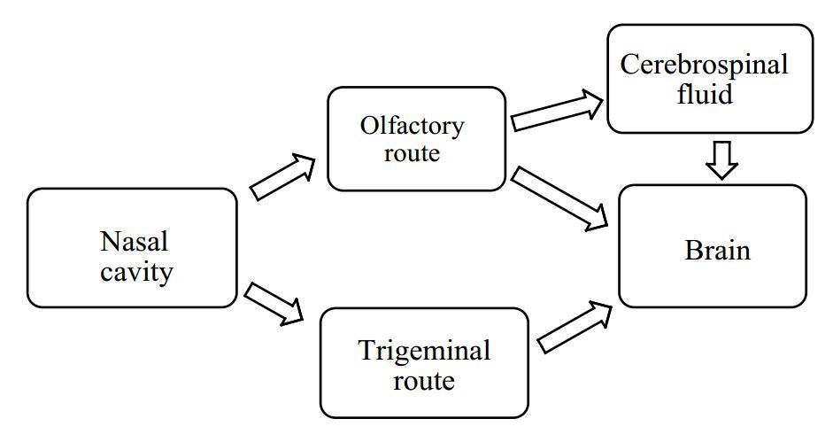 The unique relationship between nasal cavity and cranial cavity tissues in anatomy and physiology makes intranasal delivery to the brain feasible. An intranasal delivery provides some drugs with short channels to bypass the blood–brain barrier (BBB), especially for those with fairly low brain concentrations after a routine delivery, thus greatly enhancing the therapeutic effect on brain diseases. In the past two decades, a good number of encouraging outcomes have been reported in the treatment of diseases of the brain or central nervous system (CNS) through nasal administration.