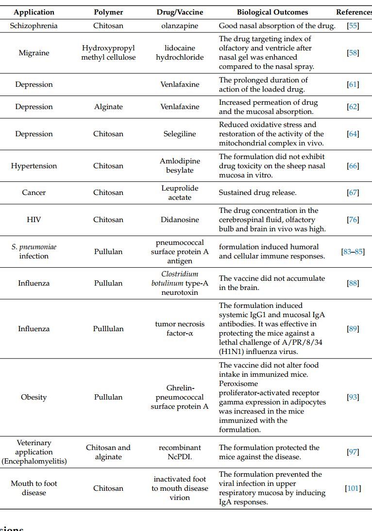 Nanogels have also been employed for the delivery of anti-depression drug resulting in a high brain/blood ratio of the drug after administration of the formulation intranasally. The olfactory and trigeminal nerve systems are involved in the nose to brain transportation of drugs to the olfactory bulb or trigeminal region in which the drug enter into other brain regions by diffusion thereby bypassing systematic circulation. Nanogels are effective as targeted carriers that protect vaccine antigens from degradation in vivo and also act as a vaccine delivery. The advantages of nanogels as vaccine delivery systems are their good loading capacity, stability and non-toxicity. The vaccine formulations of nanogels induced antibody responses which are useful for protection against viral, bacterial and lifestyle diseases. The formulation induced humoral and cellular immune response. The formulations were not transported to the brain revealing the safety of nanogels. Despite the great potentials of nanogels in drug delivery and in vaccine formulations, most of the reports are preclinical studies indicating that there is a need for these formulations to reach clinical studies. Major advances in the development of nanogel-based vaccines and drug delivery systems can be expected in the near future. However, a detailed evaluation of the current vaccines and a good understanding of disease pathology and biomaterials will provide targeted and effective delivery systems for preventive and therapeutic applications.