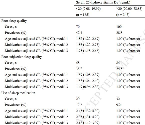CONCLUSIONS: The first quartile group of serum 25(OH)D3 was associated with the presence of poor sleep quality.