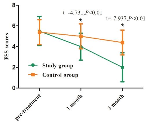 Results: A total of 532 AIS patients were consecutively recruited to participate in this study. Patients without PSF, non-vitamin D deficiency, pre-stroke fatigue, or vitamin D supplementation were excluded from the study. In addition, patients who were lost to follow-up were also excluded. Finally, 139 out of 532 (26.1%) patients with PSF and vitamin D deficiency received vitamin D supplementation treatment. Fatigue Severity Scale score was significantly lower in the study group than in the control group at 1 month (t = -4.731, p < 0.01) and 3 months (t = -7.937, p < 0.01) after treatment. One month after treatment, mRS score in the study group was lower than that in the control group without statistical difference (t = -0.660, p > 0.05), whereas mRS was significantly higher in the study group than in the control group at 3 months after treatment (t = -4.715, p < 0.01).