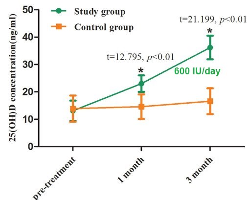 Objective: We aimed to evaluate the effect of vitamin D supplementation in post-stroke fatigue (PSF) patients with vitamin D deficiency on fatigue symptoms and outcomes. Methods: Patients with primary acute ischemic stroke (AIS) were recruited consecutively from July 2016 to June 2018. Post-stroke fatigue patients were screened out with the Fatigue Severity Scale (FSS) questionnaire, serum concentrations of 25-hydroxyvitamin D [25-(OH)-D] were assessed with enzyme-linked immunosorbent assay (ELISA), and neurological function was evaluated with FSS and modified Rankin Scale (mRS) scoring criteria. Post-stroke fatigue patients with vitamin D deficiency were divided into two groups: a study group in which patients received vitamin D supplementation (cholecalciferol, 600 IU/day) along with usual care, and a control group in which patients received usual care alone. At the end of 1 and 3 months after treatment, all PSE patients accepted re-measurement of serum vitamin D and re-evaluation of fatigue and neurological function.