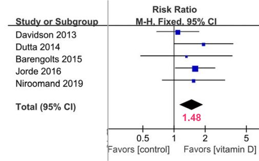 Vitamin D supplementation increased reversion rate of prediabetes to normoglycemia (RR 1.48 [95% CI 1.14-1.92]; I 2 = 0%.)