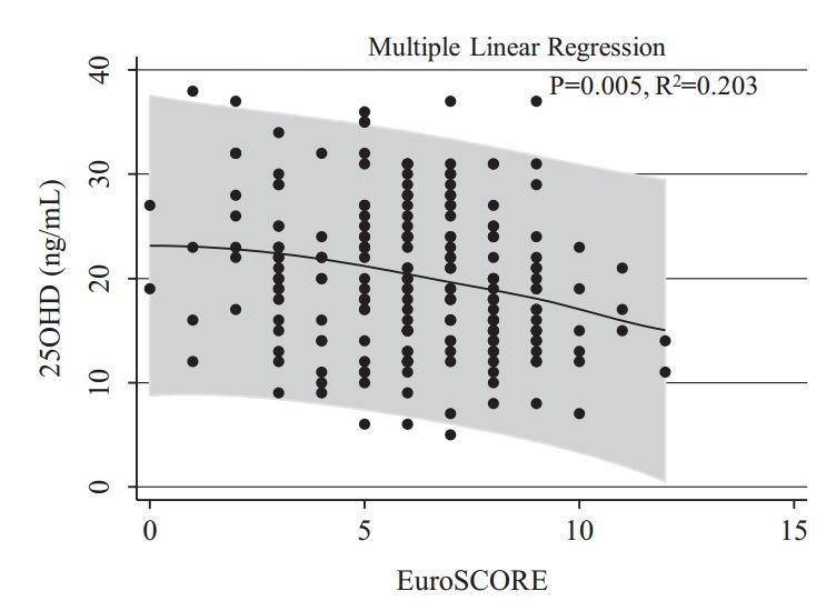 Circulating 25OHD levels, but not 1,25OHD levels, were negatively correlated with EuroSCORE (p=0.005) even after adjusted for