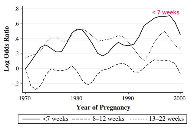 - "After accounting for abortion availability and the characteristics of pregnant women, the rate of reported miscarriages increased by about 1.0% per year. "